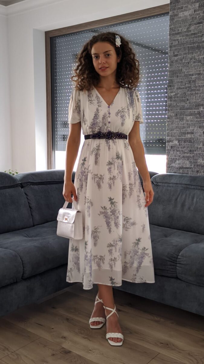 Rochie eleganta alba | Rochie cu imprimeu floral mov | 350 – 300 lei