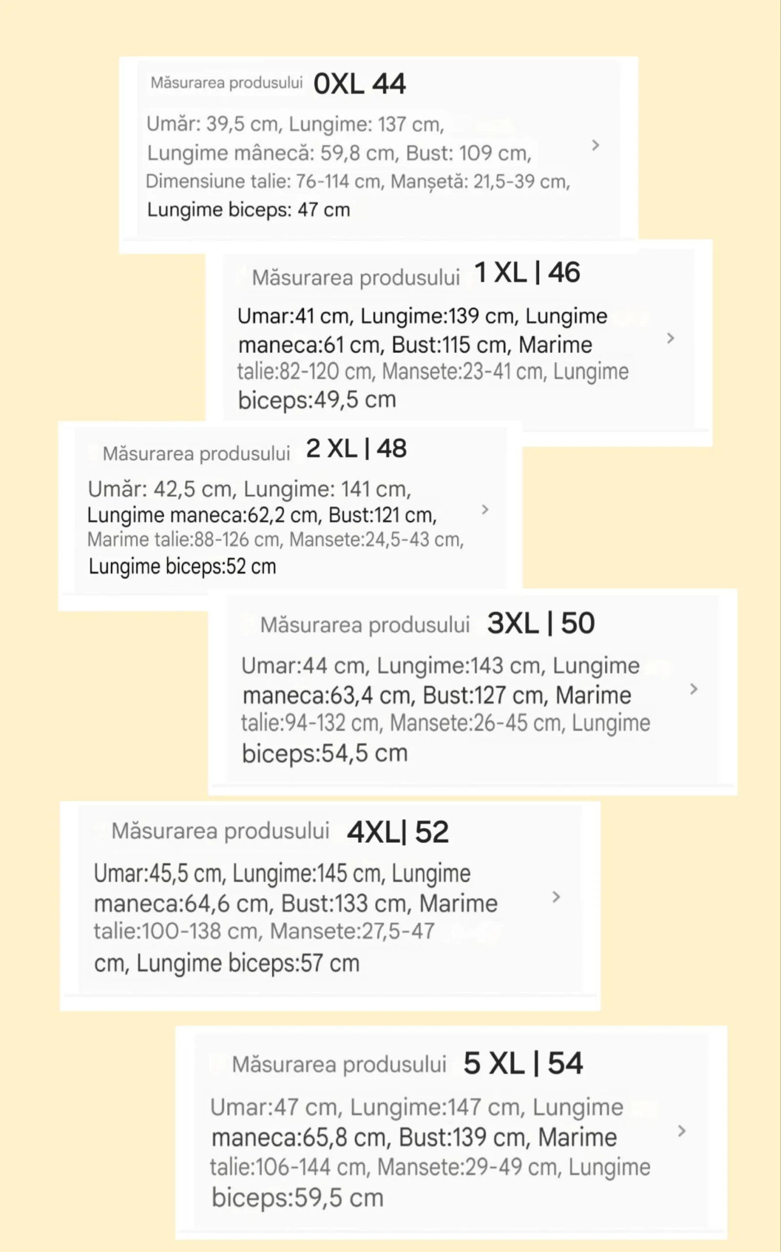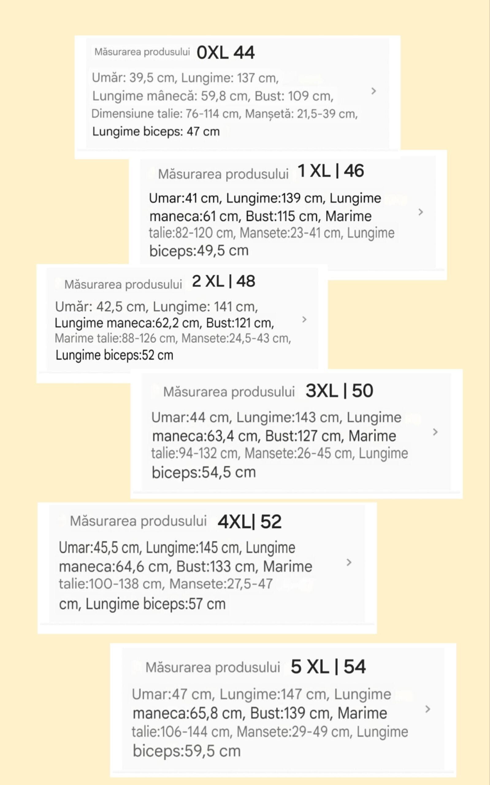 mărimeaUmărLungimeLungime mânecăBustDimensiune talieMăsura șolduluiManșetă